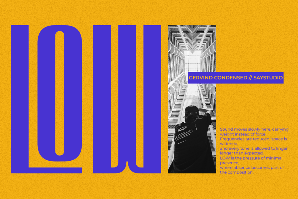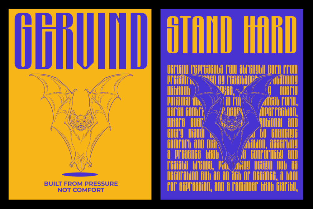 Inspired by contemporary graphic trends, editorial layouts, and commercial branding needs, Gervind excels in delivering sharp readability while maintaining a bold personality. Its condensed form allows designers to create striking compositions without sacrificing space, making it ideal for packaging, advertising, social media content, motion graphics, and UI design. Whether used in large-scale campaigns or compact layouts, Gervind ensures consistent impact across all platforms.